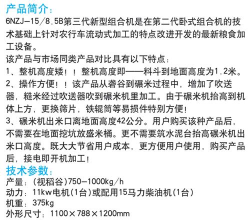 魚臺(tái)縣三高機(jī)械有限公司三高牌組合礱碾米機(jī)有NZJ和SB兩個(gè)系列,NZJ-10/8.5聯(lián)合米機(jī)85年、90年連續(xù)榮獲省優(yōu),聯(lián)系人:袁經(jīng)理:13705477344